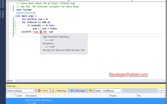 Problem When writing your first F# program , you get the following error “The type int is not compatible with … Continue reading F# Recipe #2 – The type int is not compatible with type unit
