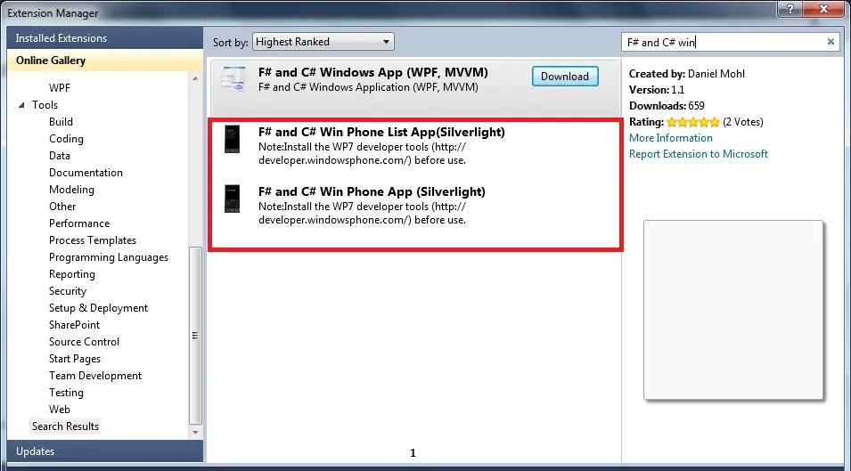 - In Visual Studio 2010, navigate to Tools – > Extension Manager -> Online Gallery and search for the term “F# and C# Win