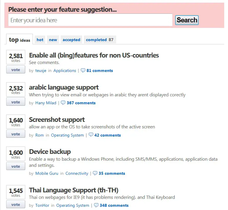 via Provide feedback for Windows Phone 8 Features via Suggestion Box