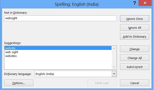 2. This will display a dialog which displays the “Not in Dictionary” and the “Suggestions” for correcting the mistakes. The users will also be able to add new words in to the dictionary via the “Add to dictionary” button. Click “Change” to apply the spell check suggestions.