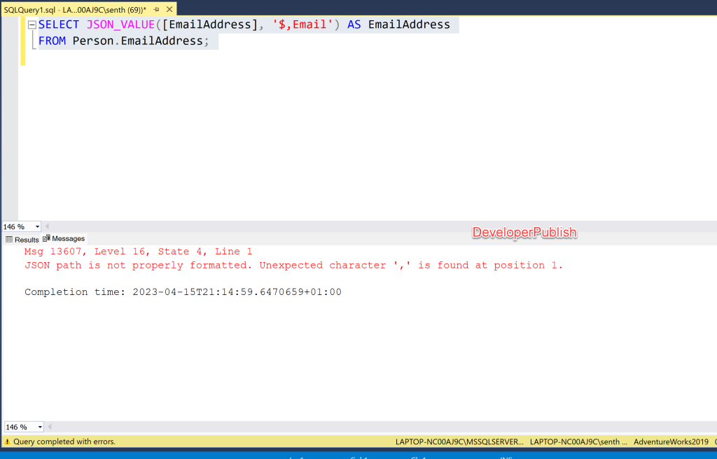 Let’s say we have an EmailAddress table in the AdventureWorks2019 database with a column named EmailAddress that stores JSON data. We want to retrieve the value of the “Email” property from the JSON objects in the EmailAddress column: